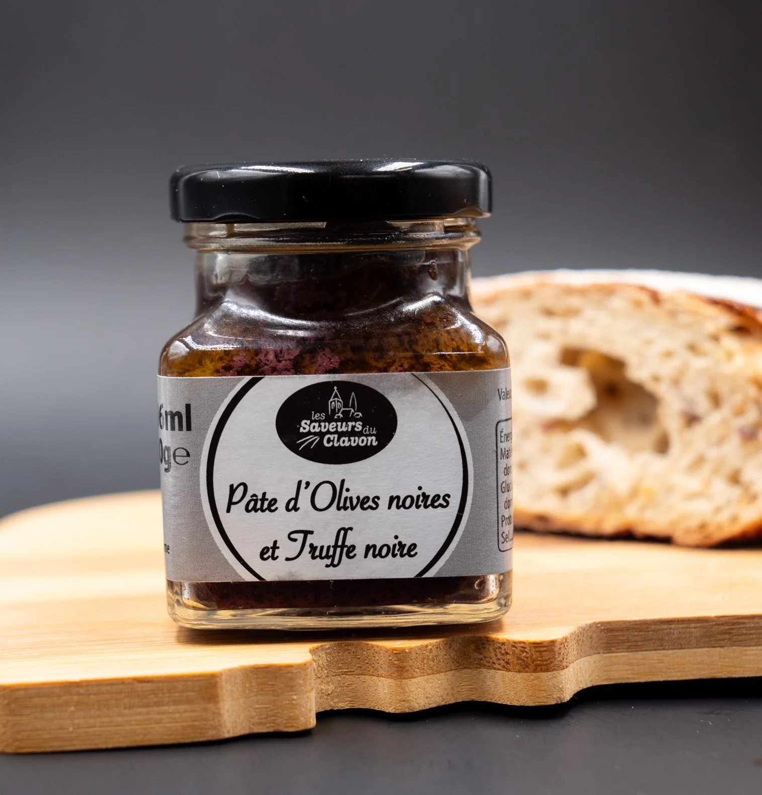 Mélange artisanal de fines olives noires et de truffe noire, dans un pot de 80 grammes.